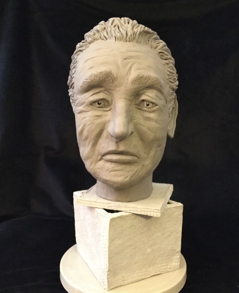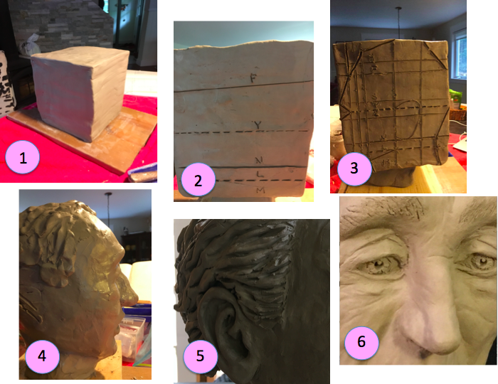 1 – Mon bloc d’argile au départ. 2 – Je trace les lignes principales (front, yeux, etc.). 3- Je reporte ces mêmes lignes sur les profils en positionnant les oreilles. 4 – Puis les formes se dessinent. 5 – Les détails des oreilles se précisent. 6 – Les détails des yeux naissent, le regard apparaît et plonge dans les souvenirs.