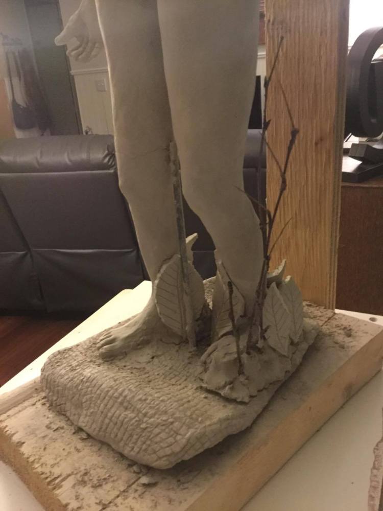 Et voici pour la petite histoire, j’ai rencontré en effet quelques difficultés aux pieds, la fondation de ma sculpture … En effet après avoir enlevé trop de matière pour affiner les pieds, ceux-ci se sont désolidarisés du socle. Les pieds à ce moment avaient déjà séchés, ainsi que le socle, de sorte que je ne pouvais donc plus les recoller ensemble à l’aide de la barbotine. Ce qui explique pourquoi j’ai ajouté des masses d’argile de par et d’autres des pieds pour bien les ancrer au socle et pour camoufler le tout j’ai ajouté des feuilles que j’ai moulées à partir des feuilles que j’ai trouvé dehors dans la nature.