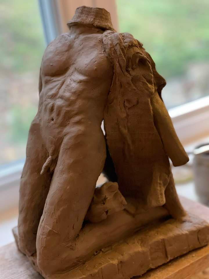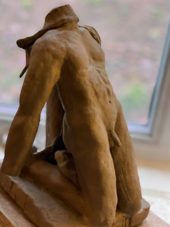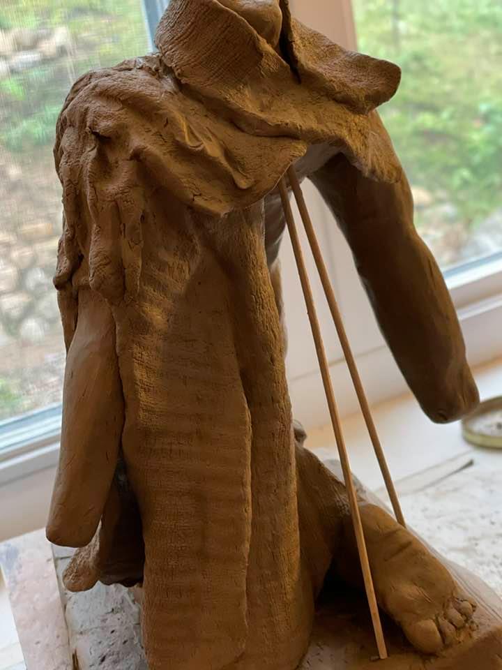 Sa position agenouillée a nécessité des appuis en argile derrière les genoux ainsi que des bâtonnets en bois afin de prendre appui et contrer l’effet de la gravité. Ces appuis sont temporaires, d’ici que la terre prenne … un peu comme s’il avait besoin de prendre racine pour qu’il ait foi en son humanité.