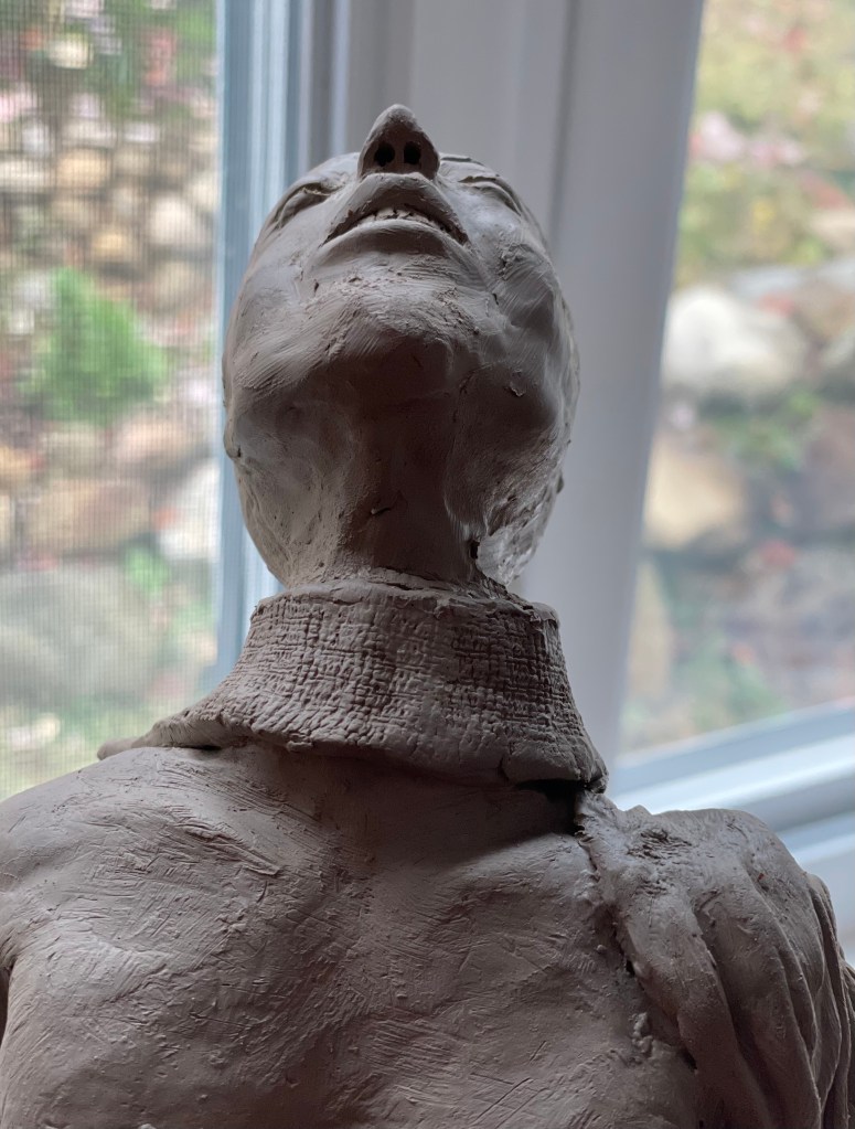 La tête prend forme. Comme pour le corps, j’y ai placé une boule d’argile à l’arrière comme appui (temporaire). J’en ai profité pour corriger les plis du drapé. Fas facile de créer le réalisme des drapés, je me suis inspirée d’un vrai tissu posé sur le dossier d’une chaise.