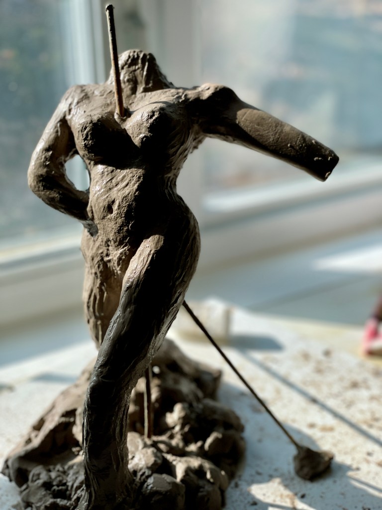 Ci-dessous le point de départ de mon modelage, une fois décidé de l’échelle (1:6 dans ce cas par rapport à l’échelle humaine), de la posture et du mouvement du corps ainsi que des proportions.