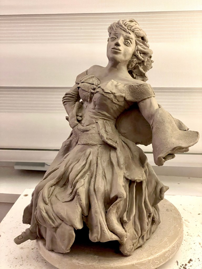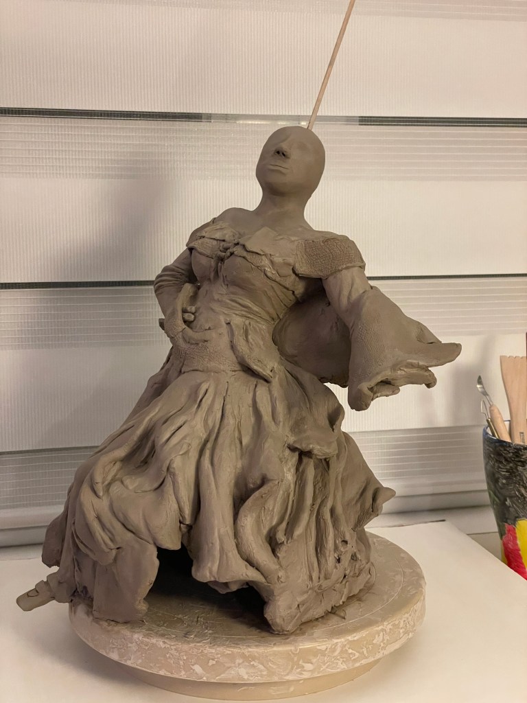 Puis j’ai modelé la forme générale de la tête. J’ai travaillé ensuite le drapé de sa robe en donnant du mouvement et en accordant beaucoup de soin pour former les plis du chemiser afin d’apporter du réalisme à l’ensemble.