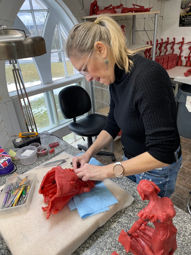 Me voici dans l’atelier de la Fonderie d’Art d’Inverness et voilà mes 3 épreuves en cire reproduisant fidèlement mes argiles après moulage en silicone.