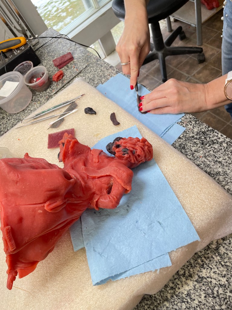 Et moi aussi je mets la main à la pâte ! Je retouche ici un morceau du châle qui avait décollé lors du moulage.
