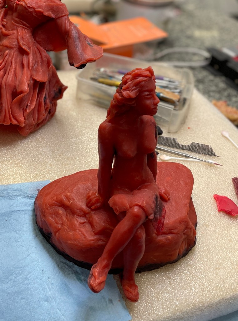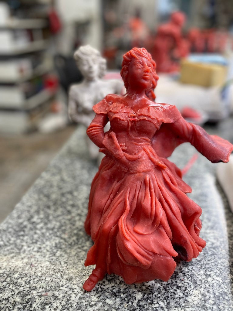 Voilà la danseuse Insoumise prête et en route pour la prochaine étape, qui consistera au moulage par une céramique haute température en vue de recevoir le bronze en fusion. En arrière plan … l’argile originale dont est issue mon épreuve en cire.