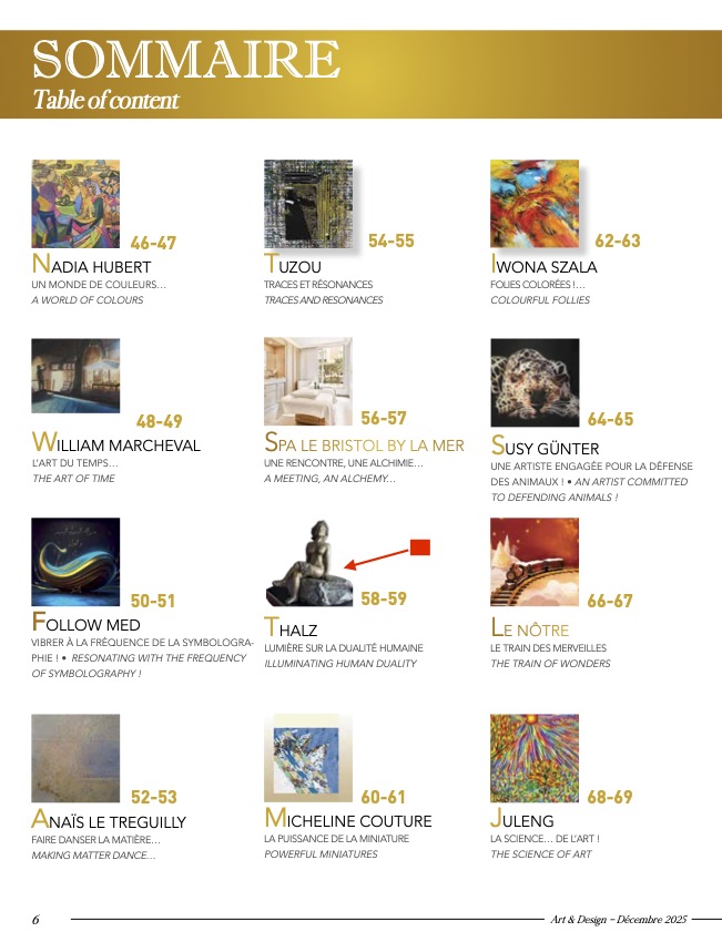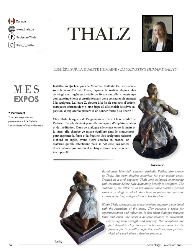Quelle fierté de voir son travail présenté dans le magazine français Art & Design – édition Déc 2025-Fév 2026 ! Deux pages consacrées à mes sculptures en bronze, à mon parcours d’ingénieure à sculpteure et à ma démarche artistique.