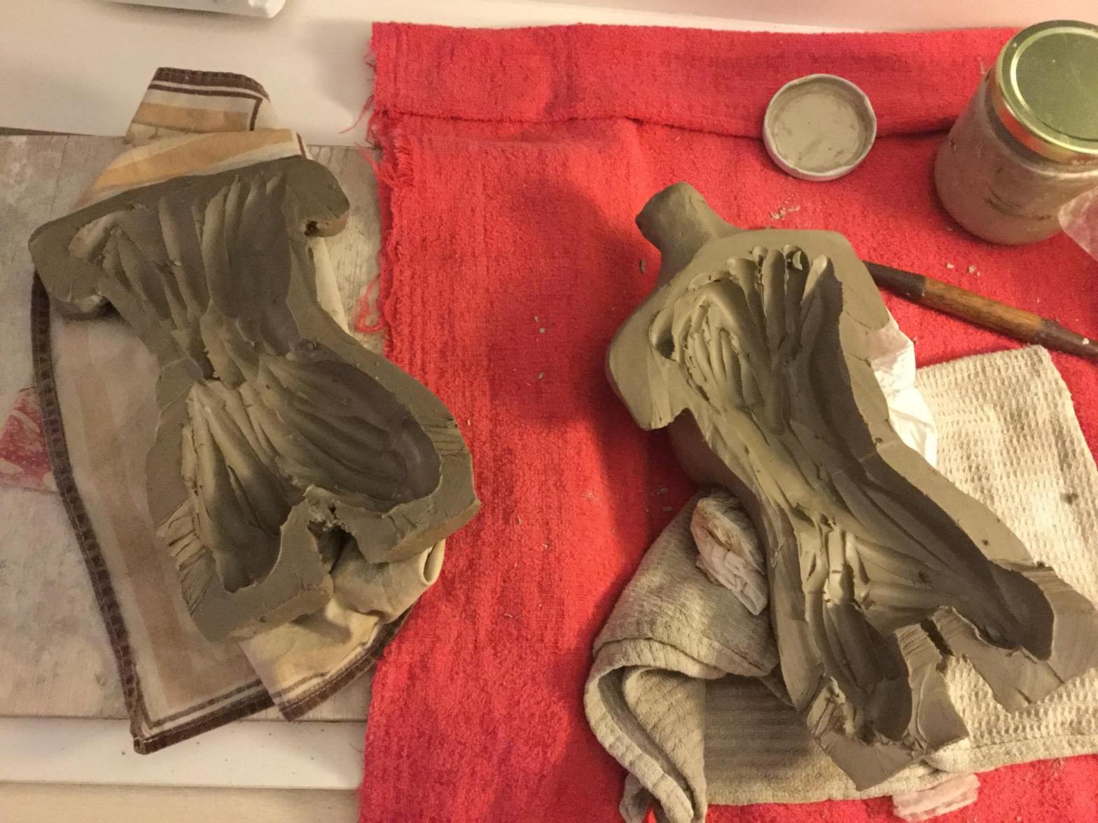 Cela permet de récupérer de l’argile, d’alléger la sculpture et de réduire les risques de fissuration lors du séchage (à l’air libre dans mon cas). Ensuite on recolle les morceaux à l’aide de la barbotine. Une technique que j’applique depuis peu, j’adore cette étape !