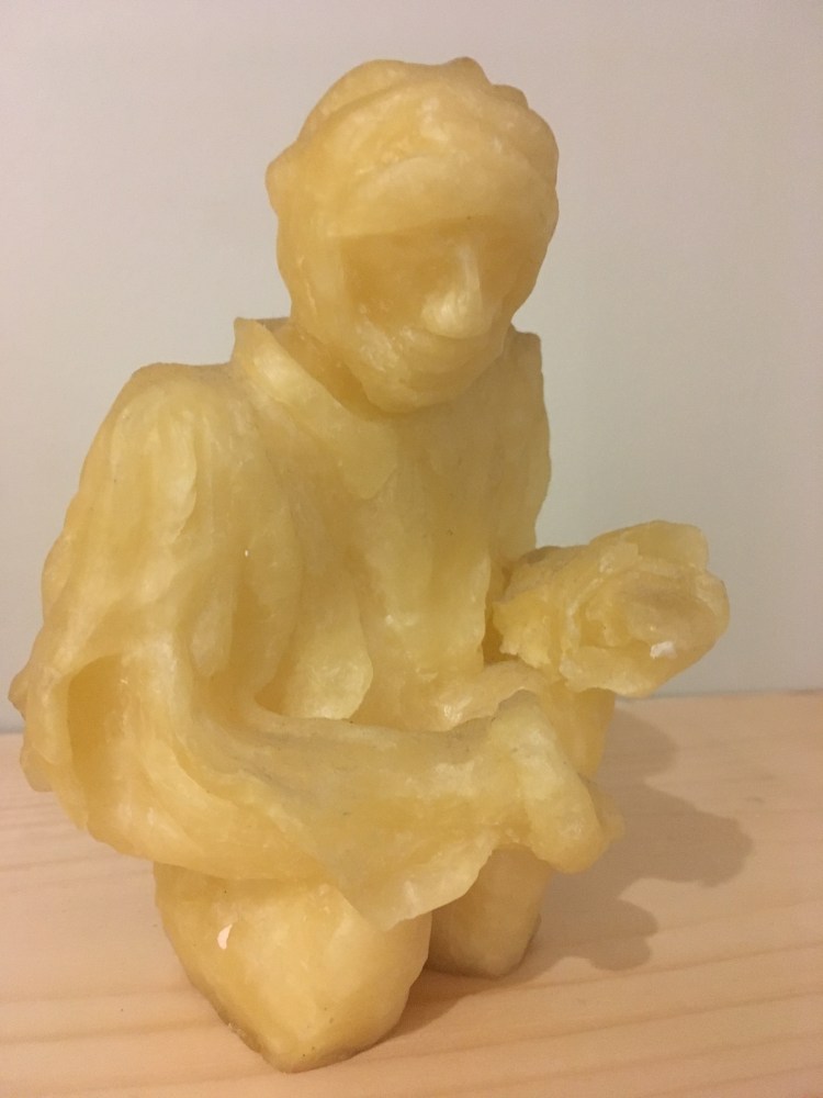 Malgré sa petite taille, cette sculpture dégage une présence imposante et semble figée dans le temps tant le sujet semble ancré dans le sol, ce qui contraste avec la temporalité de la cire dans laquelle elle a été façonnée. Son expression ainsi que son regard vers la terre lui confère une aura de mystère et d’immortalité. L’œuvre reste inachevée, laissant ainsi place à l’imagination et à l’interprétation de chacun.