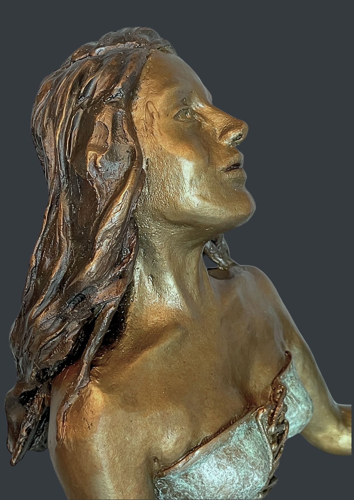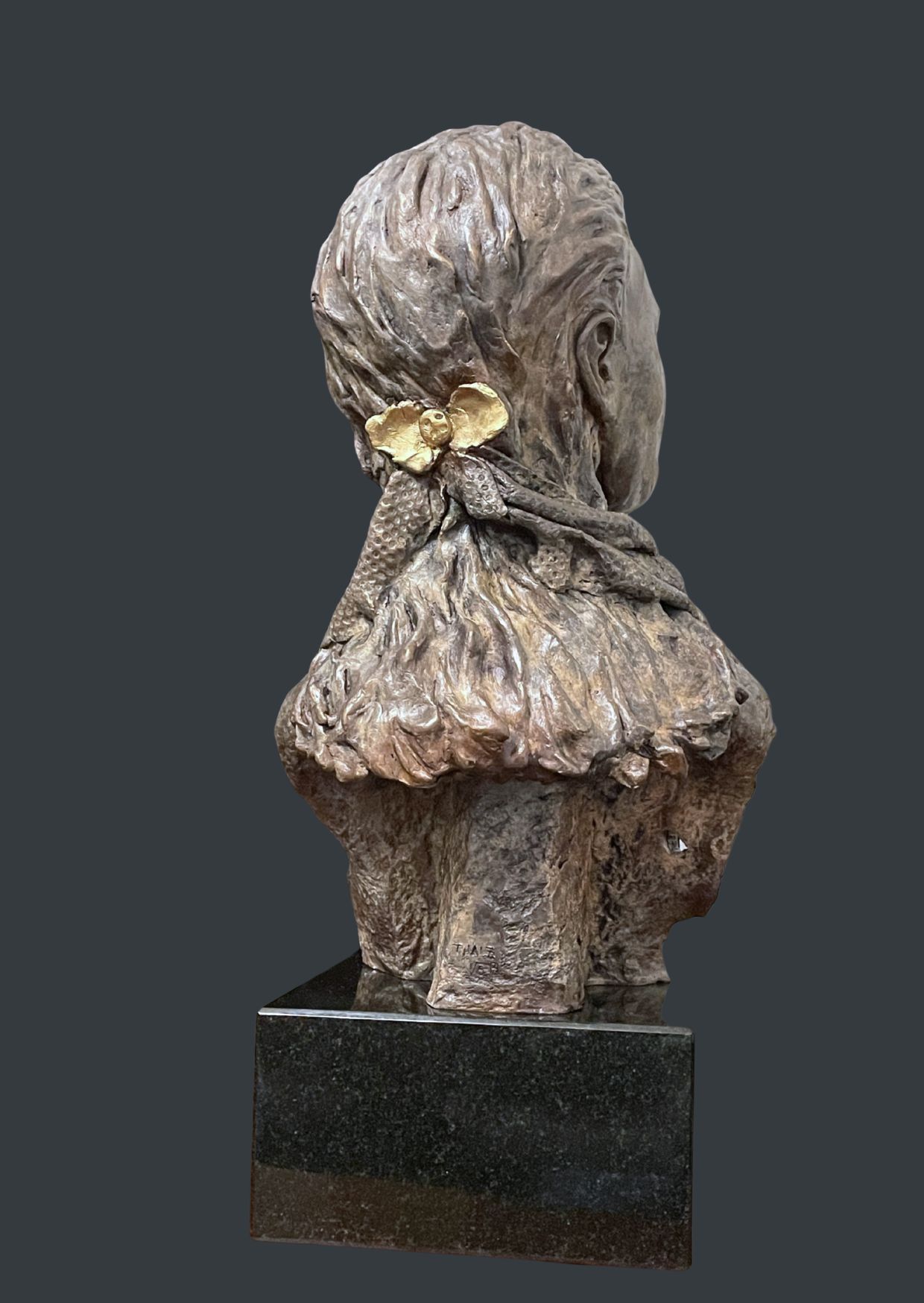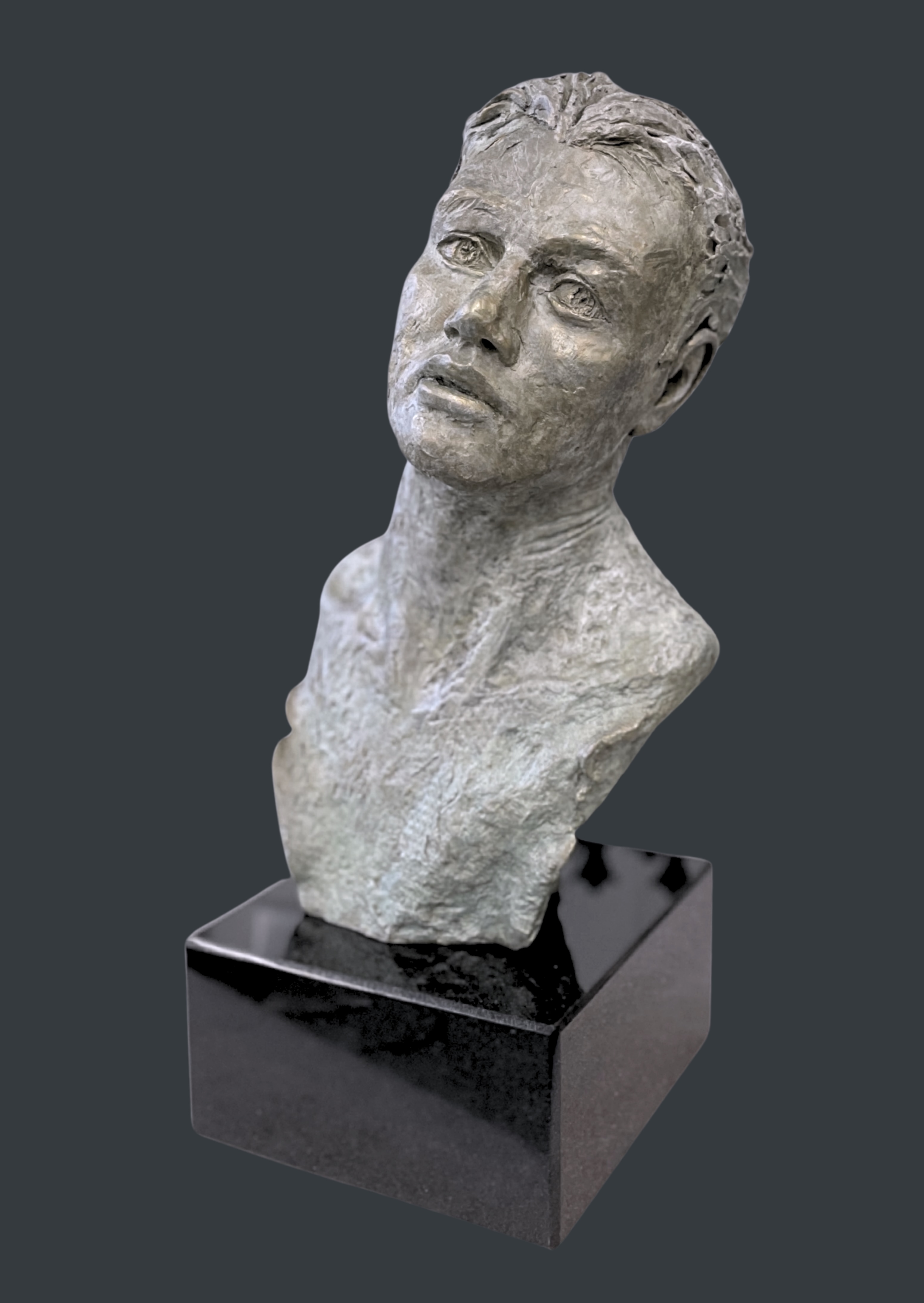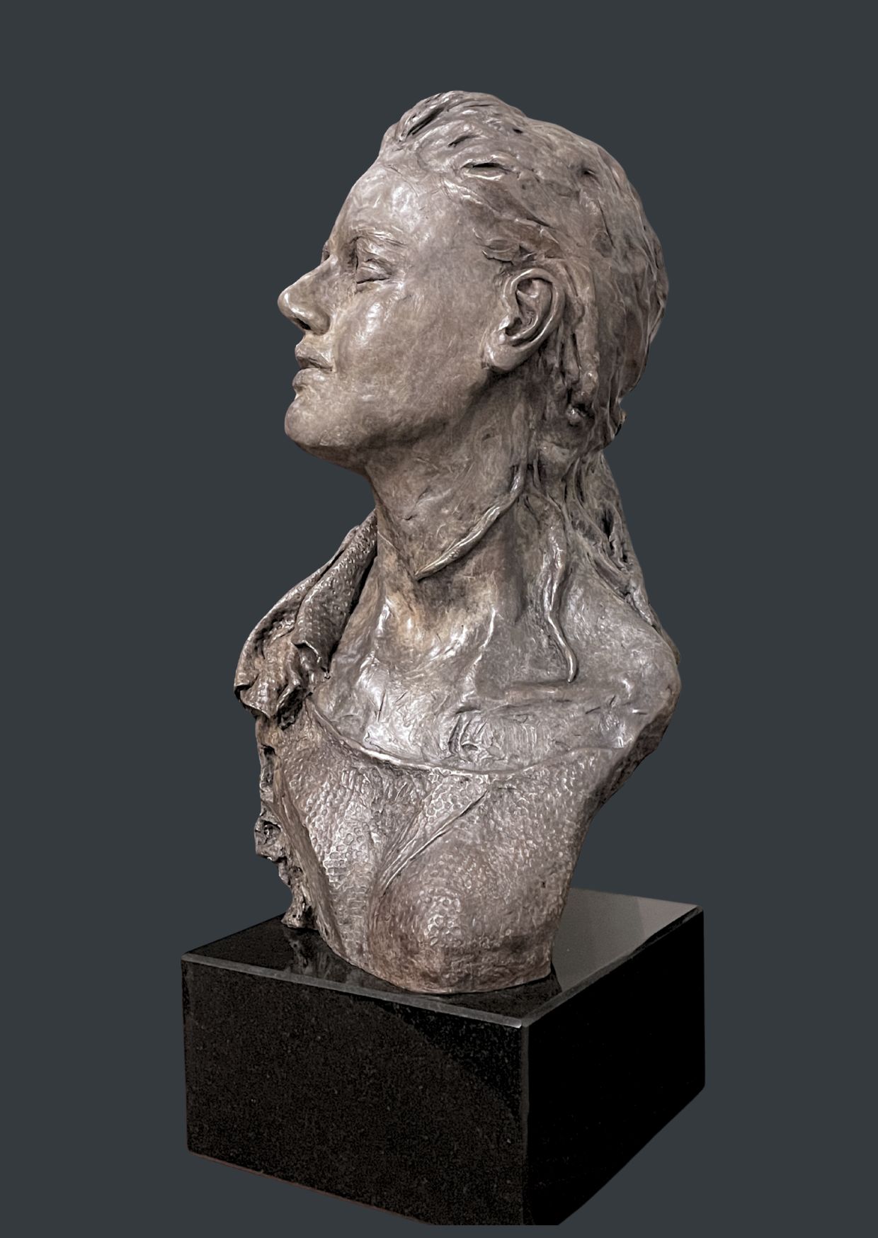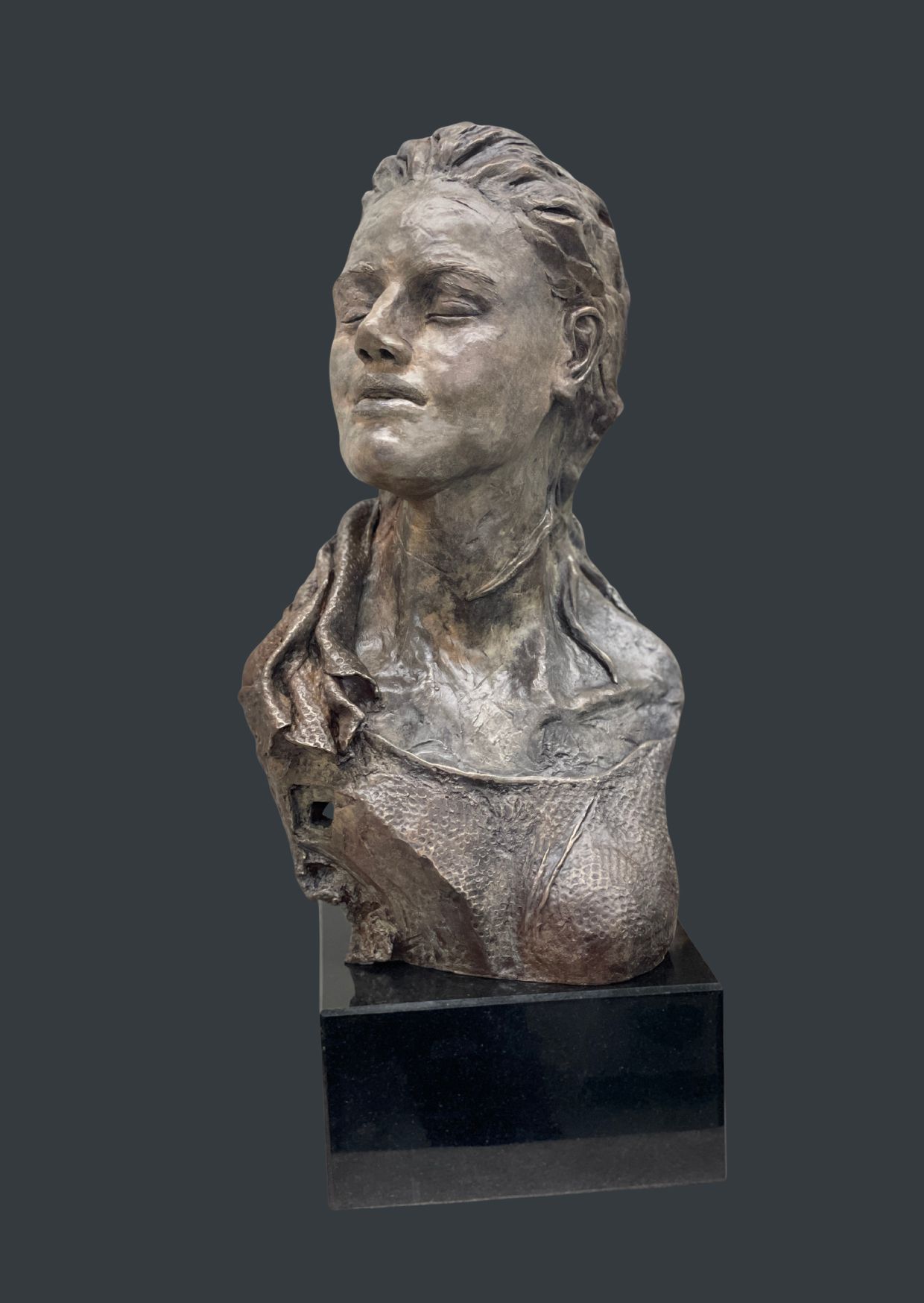 Posé sur un socle de granit, ce buste atteint une hauteur totale de 52 cm, se rapprochant de la taille humaine. J’ai cherché à susciter une émotion profonde à travers les yeux clos du buste. Cette entreprise s’est révélée être un défi de taille. Les yeux sont fermés pour symboliser un regard intérieur pour mieux appréhender l’avenir.
